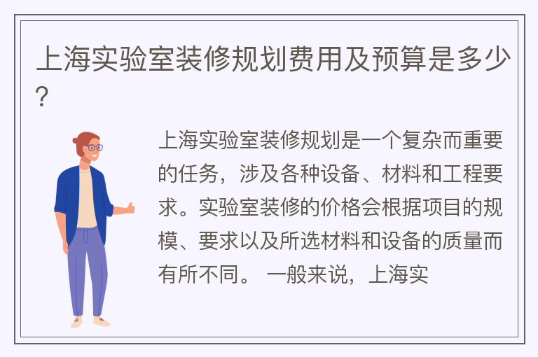 上海实验室装修规划是一个复杂而重要的任务,涉及各种设备、材料和工程要求。实验室装修的价格会根据项目的规模、要求以及所选材料和设备的质量而有所不同。 一般来说,上海实......【点击详情】