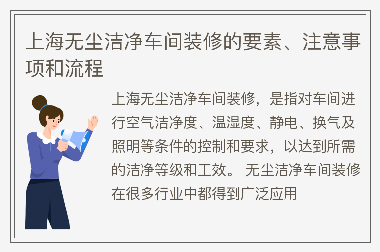 上海无尘洁净车间装修,是指对车间进行空气洁净度、温湿度、静电、换气及照明等条件的控制和要求,以达到所需的洁净等级和工效。 无尘洁净车间装修在很多行业中都得到广泛应用......【点击详情】