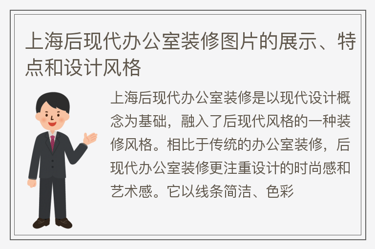 上海后现代办公室装修是以现代设计概念为基础,融入了后现代风格的一种装修风格。相比于传统的办公室装修,后现代办公室装修更注重设计的时尚感和艺术感。它以线条简洁、色彩......【点击详情】