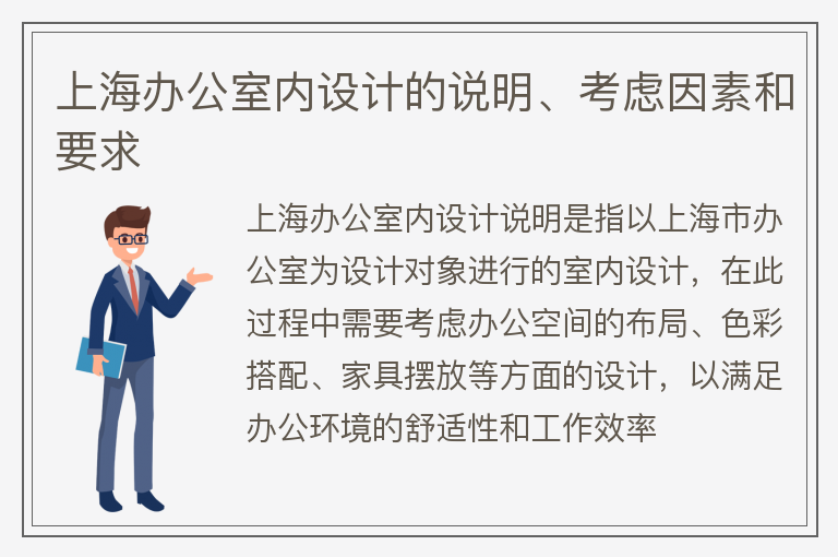 上海办公室内设计说明是指以上海市办公室为设计对象进行的室内设计,在此过程中需要考虑办公空间的布局、色彩搭配、家具摆放等方面的设计,以满足办公环境的舒适性和工作效率......【点击详情】