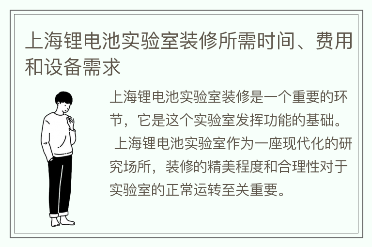 上海锂电池实验室装修是一个重要的环节,它是这个实验室发挥功能的基础。 上海锂电池实验室作为一座现代化的研究场所,装修的精美程度和合理性对于实验室的正常运转至关重要。......【点击详情】