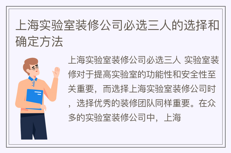 上海实验室装修公司必选三人 实验室装修对于提高实验室的功能性和安全性至关重要,而选择上海实验室装修公司时,选择优秀的装修团队同样重要。在众多的实验室装修公司中,上海......【点击详情】