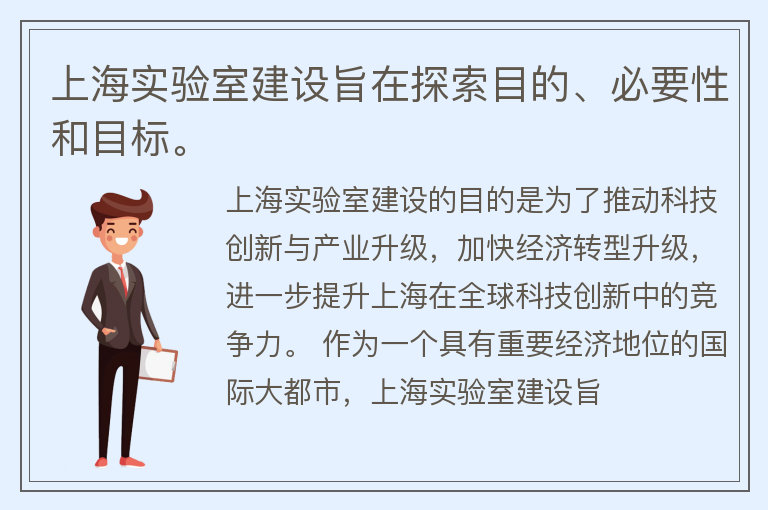 上海实验室建设的目的是为了推动科技创新与产业升级,加快经济转型升级,进一步提升上海在全球科技创新中的竞争力。 作为一个具有重要经济地位的国际大都市,上海实验室建设旨......【点击详情】