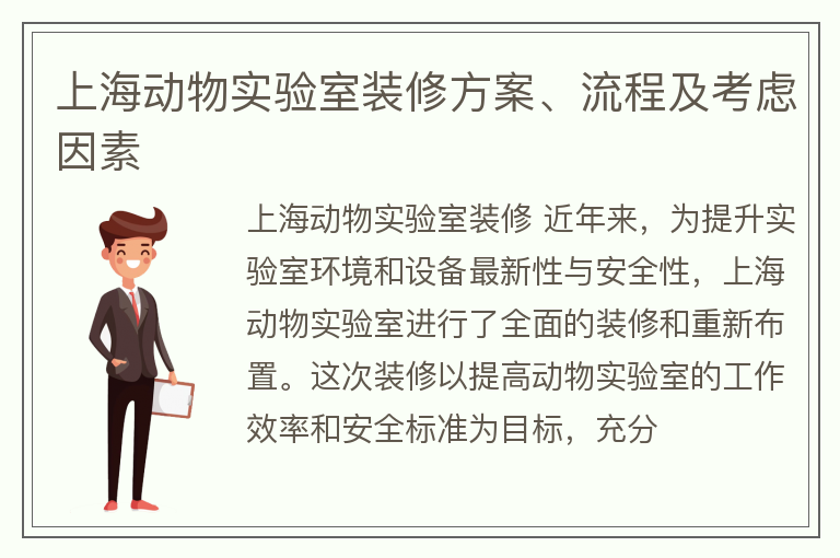上海动物实验室装修 近年来,为提升实验室环境和设备最新性与安全性,上海动物实验室进行了全面的装修和重新布置。这次装修以提高动物实验室的工作效率和安全标准为目标,充分......【点击详情】