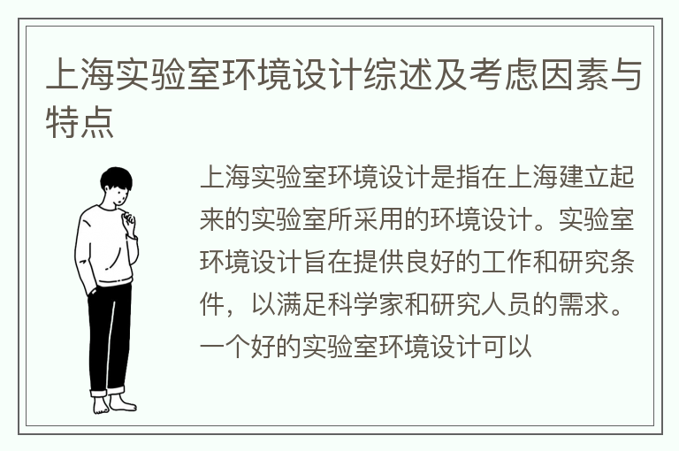 上海实验室环境设计是指在上海建立起来的实验室所采用的环境设计。实验室环境设计旨在提供良好的工作和研究条件,以满足科学家和研究人员的需求。一个好的实验室环境设计可以......【点击详情】