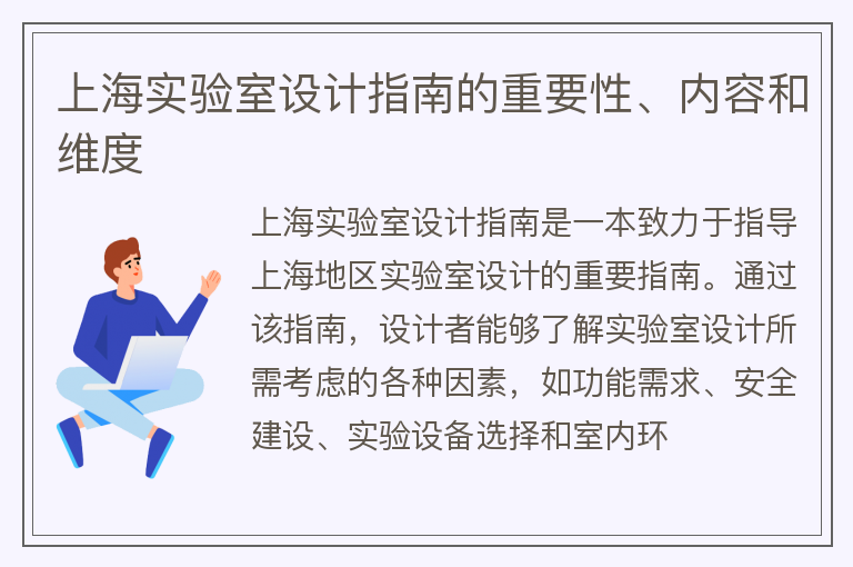 上海实验室设计指南是一本致力于指导上海地区实验室设计的重要指南。通过该指南,设计者能够了解实验室设计所需考虑的各种因素,如功能需求、安全建设、实验设备选择和室内环......【点击详情】