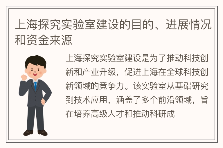 上海探究实验室建设是为了推动科技创新和产业升级,促进上海在全球科技创新领域的竞争力。该实验室从基础研究到技术应用,涵盖了多个前沿领域,旨在培养高级人才和推动科研成......【点击详情】