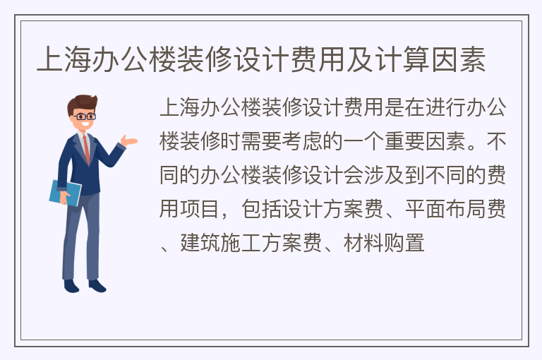 上海办公楼装修设计费用是在进行办公楼装修时需要考虑的一个重要因素。不同的办公楼装修设计会涉及到不同的费用项目,包括设计方案费、平面布局费、建筑施工方案费、材料购置......【点击详情】
