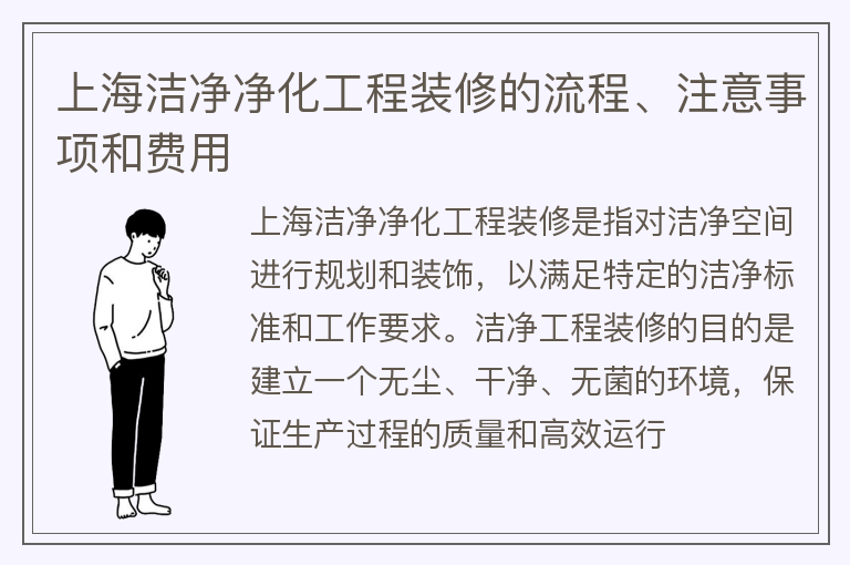 上海洁净净化工程装修是指对洁净空间进行规划和装饰,以满足特定的洁净标准和工作要求。洁净工程装修的目的是建立一个无尘、干净、无菌的环境,保证生产过程的质量和高效运行......【点击详情】