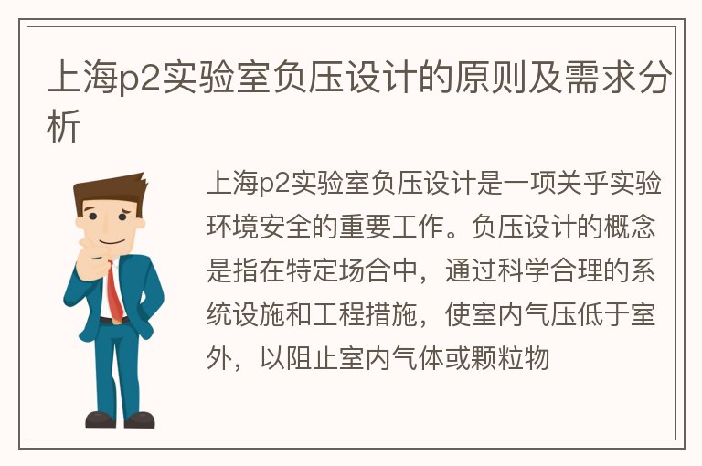 上海p2实验室负压设计是一项关乎实验环境安全的重要工作。负压设计的概念是指在特定场合中,通过科学合理的系统设施和工程措施,使室内气压低于室外,以阻止室内气体或颗粒物......【点击详情】