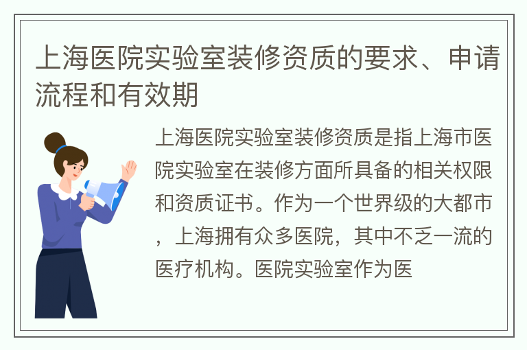 上海医院实验室装修资质是指上海市医院实验室在装修方面所具备的相关权限和资质证书。作为一个世界级的大都市,上海拥有众多医院,其中不乏一流的医疗机构。医院实验室作为医......【点击详情】