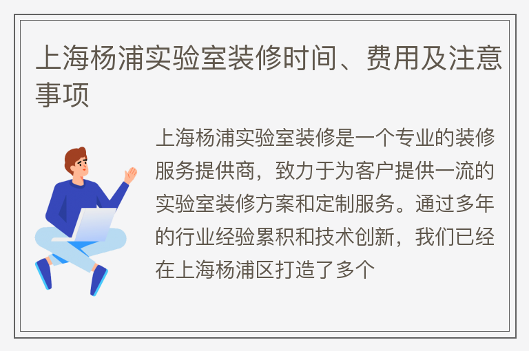 上海杨浦实验室装修是一个专业的装修服务提供商,致力于为客户提供一流的实验室装修方案和定制服务。通过多年的行业经验累积和技术创新,我们已经在上海杨浦区打造了多个......【点击详情】