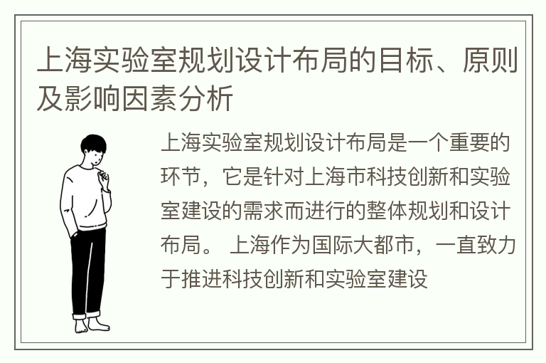 上海实验室规划设计布局是一个重要的环节,它是针对上海市科技创新和实验室建设的需求而进行的整体规划和设计布局。 上海作为国际大都市,一直致力于推进科技创新和实验室建设......【点击详情】