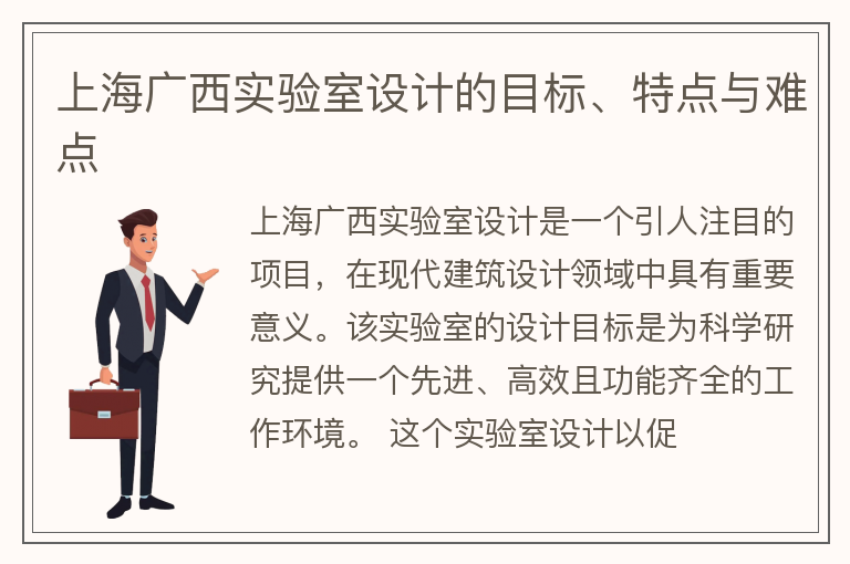 上海广西实验室设计是一个引人注目的项目,在现代建筑设计领域中具有重要意义。该实验室的设计目标是为科学研究提供一个先进、高效且功能齐全的工作环境。 这个实验室设计以促......【点击详情】