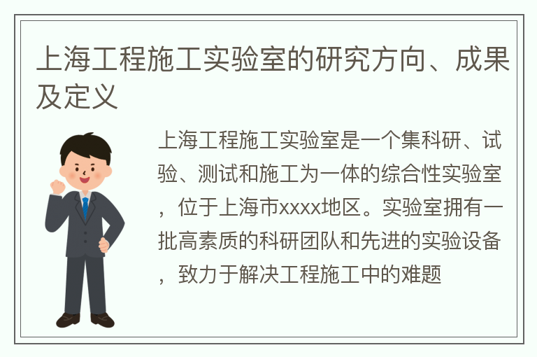 上海工程施工实验室是一个集科研、试验、测试和施工为一体的综合性实验室,位于上海市xxxx地区。实验室拥有一批高素质的科研团队和先进的实验设备,致力于解决工程施工中的难题......【点击详情】