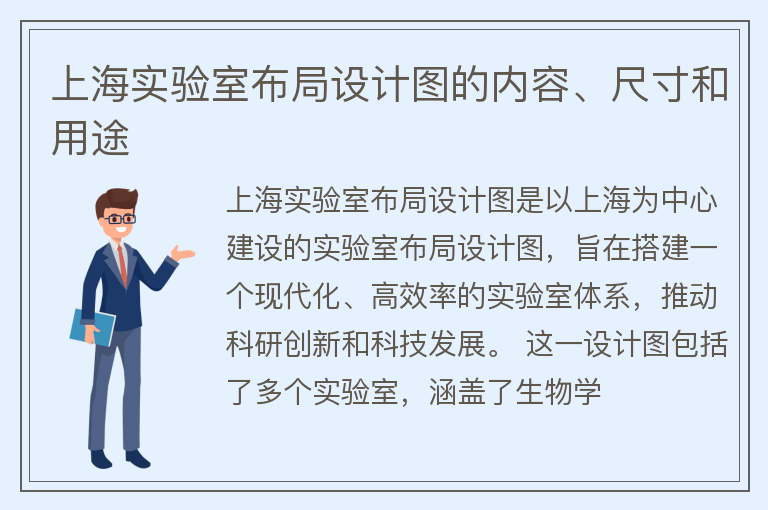 上海实验室布局设计图是以上海为中心建设的实验室布局设计图,旨在搭建一个现代化、高效率的实验室体系,推动科研创新和科技发展。 这一设计图包括了多个实验室,涵盖了生物学......【点击详情】