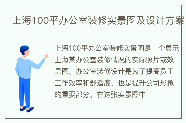 上海100平办公室装修实景图是一个展示上海某办公室装修情况的实际照片或效果图。办公室装修设计是为了提高员工工作效率和舒适度,也是提升公司形象的重要部分。在这张实景图中......【点击详情】