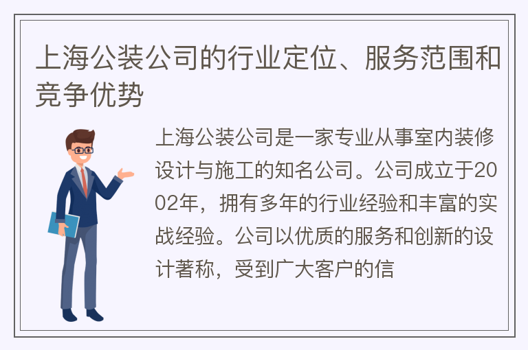 上海公装公司是一家专业从事室内装修设计与施工的知名公司。公司成立于2002年,拥有多年的行业经验和丰富的实战经验。公司以优质的服务和创新的设计著称,受到广大客户的信......【点击详情】