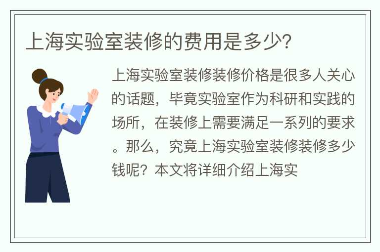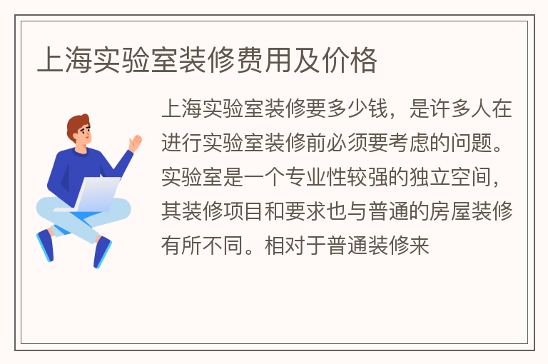上海实验室装修要多少钱,是许多人在进行实验室装修前必须要考虑的问题。实验室是一个专业性较强的独立空间,其装修项目和要求也与普通的房屋装修有所不同。相对于普通装修来......【点击详情】