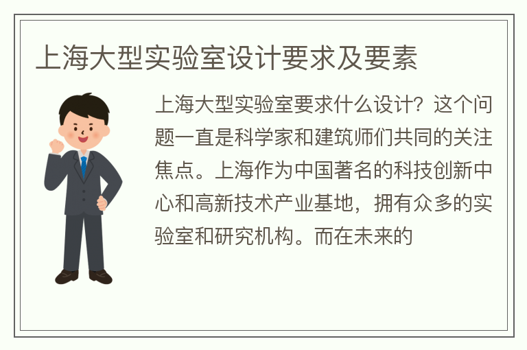 上海大型实验室要求什么设计?这个问题一直是科学家和建筑师们共同的关注焦点。上海作为中国著名的科技创新中心和高新技术产业基地,拥有众多的实验室和研究机构。而在未来的......【点击详情】