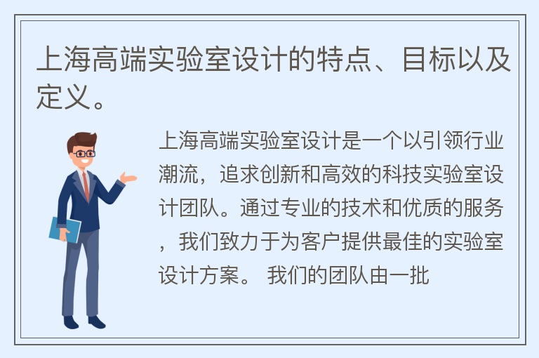 上海高端实验室设计是一个以引领行业潮流,追求创新和高效的科技实验室设计团队。通过专业的技术和优质的服务,我们致力于为客户提供最佳的实验室设计方案。 我们的团队由一批......【点击详情】