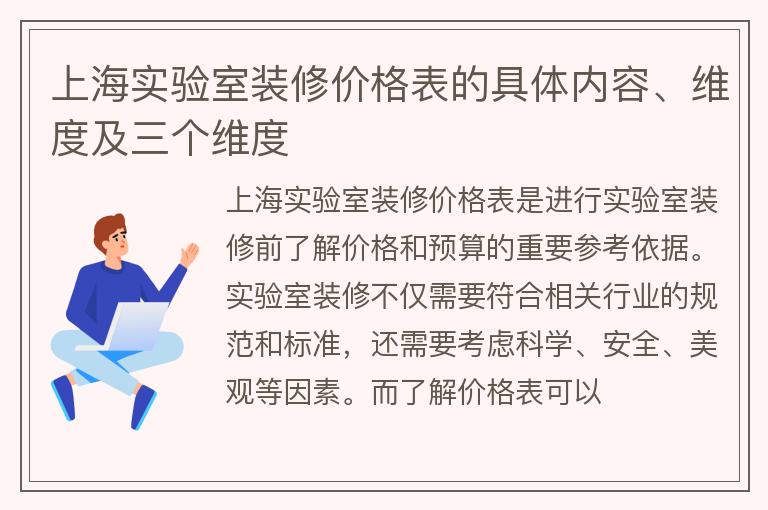 上海实验室装修价格表是进行实验室装修前了解价格和预算的重要参考依据。实验室装修不仅需要符合相关行业的规范和标准,还需要考虑科学、安全、美观等因素。而了解价格表可以......【点击详情】