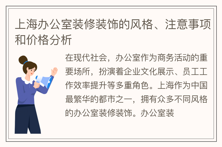 在现代社会,办公室作为商务活动的重要场所,扮演着企业文化展示、员工工作效率提升等多重角色。上海作为中国最繁华的都市之一,拥有众多不同风格的办公室装修装饰。办公室装......【点击详情】