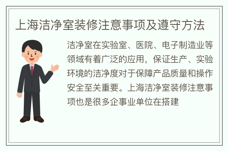 洁净室在实验室、医院、电子制造业等领域有着广泛的应用,保证生产、实验环境的洁净度对于保障产品质量和操作安全至关重要。上海洁净室装修注意事项也是很多企事业单位在搭建......【点击详情】