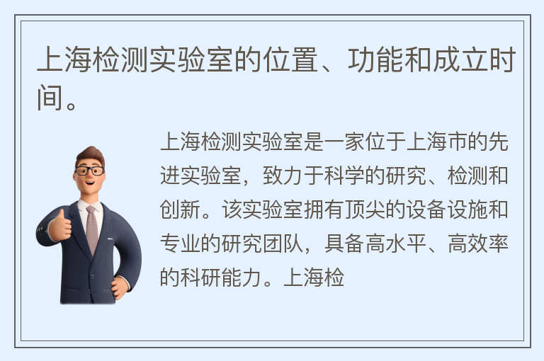 上海检测实验室是一家位于上海市的先进实验室,致力于科学的研究、检测和创新。该实验室拥有顶尖的设备设施和专业的研究团队,具备高水平、高效率的科研能力。上海检......【点击详情】