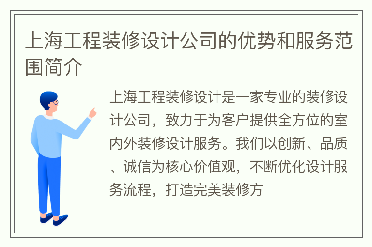 在上海,有很多企业和个人都需要进行一些工程装修与设计的服务。在选择合适的工程装修设计公司时,他们常常会遇到一些问题,比如不知道该如何选择、对公司的服务范围不太清楚等等。那么,上海工程装修设计究竟涉及哪些方面呢?下面,我们就来详细探究一下。