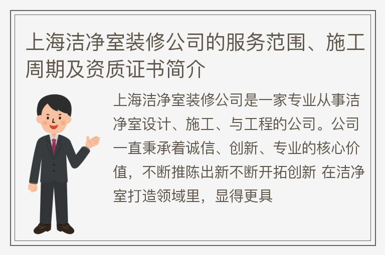 洁净室装修是一项高要求的建筑工程,需要专业的技术和资质才能开展。在选择上海洁净室装修公司时,除了看公司的实力和口碑,还需了解其资质证书的情况。那么,上海洁净室装修公司的资质证书有哪些呢?下面就为大家一一介绍。