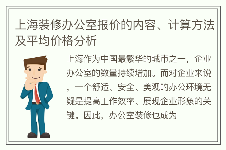 在进行办公室装修时,很多人都很关心的是装修的费用问题,因此知道怎样计算装修报价是非常重要的。下面就给大家介绍一下上海装修办公室报价如何计算。