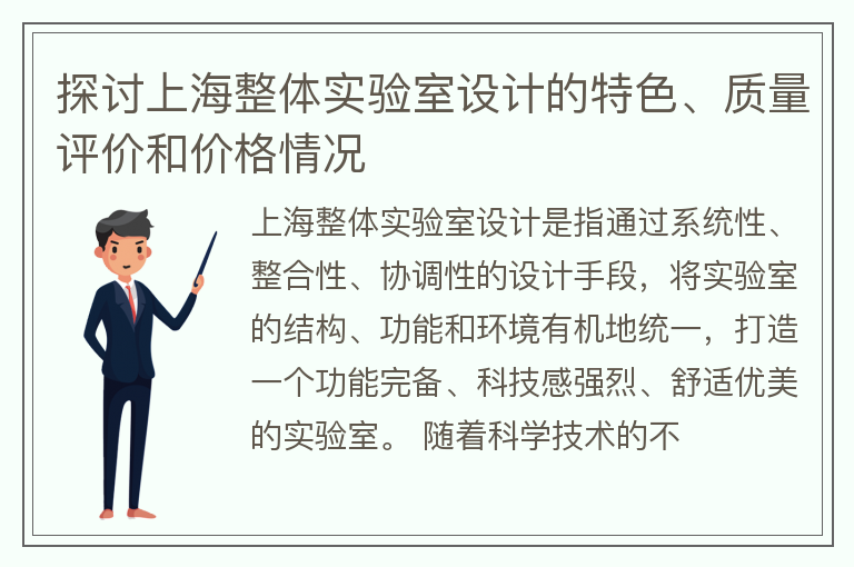 在现代实验室设计中,实用性和安全性是最为关键的因素。一个好的实验室设计不仅需要满足基本的实验需求,还需要考虑到防护、设备布局及易操作性等方面。而上海整体实验室一直被认为是专业的实验室设计公司之一,其作品也得到了广泛的赞誉。对于这家公司的设计工作,我们应该如何进行评价呢?