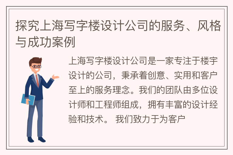 如今,随着城市发展的不断壮大,各种新型建筑不断涌现。尤其是在写字楼等商业建筑领域,客户对于设计的要求越来越高。本文将会介绍一家在上海地区非常有影响力的写字楼设计公司,他们的成功案例。
