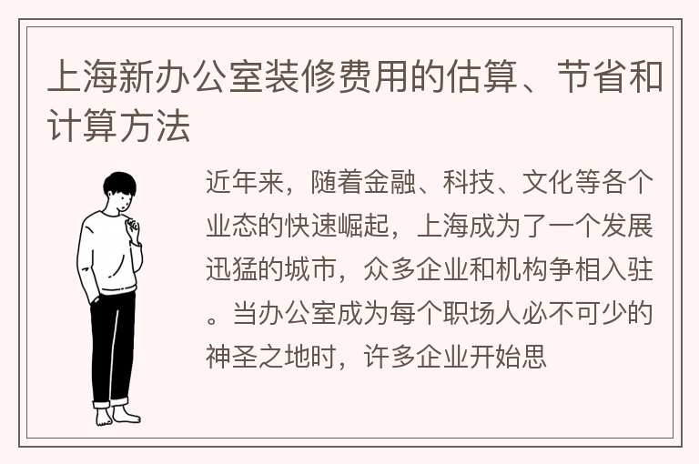 近年来,随着金融、科技、文化等各个业态的快速崛起,上海成为了一个发展迅猛的城市,众多企业和机构争相入驻。当办公室成为每个职场人必不可少的神圣之地时,许多企业开始思考,如何通过办公环境来实现企业价值的最大升华。其中,办公室装修是不可或缺的一环。本文将为您详细讲解上海新办公室装修费用问题,为您提供装修实用建议和预算对比。