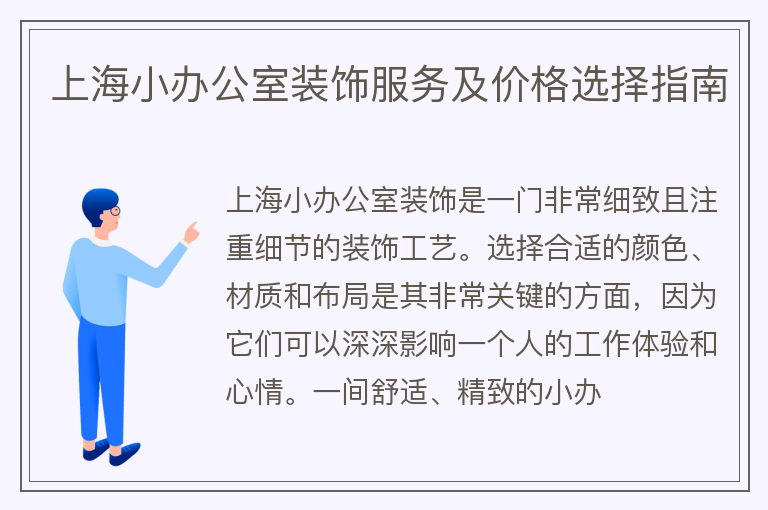 在这个快节奏的生活中,办公室被认为是我们“第二个家”。因此,办公室的布置对于员工们意义非凡。它不仅代表了企业的文化和形象,也直接影响到员工们的心情与工作效率。上海小办公室装饰在这一领域拥有丰富的经验,为客户提供一系列的设计、装修等服务。本文将就上海小办公室装饰提供哪些服务作一详细介绍。