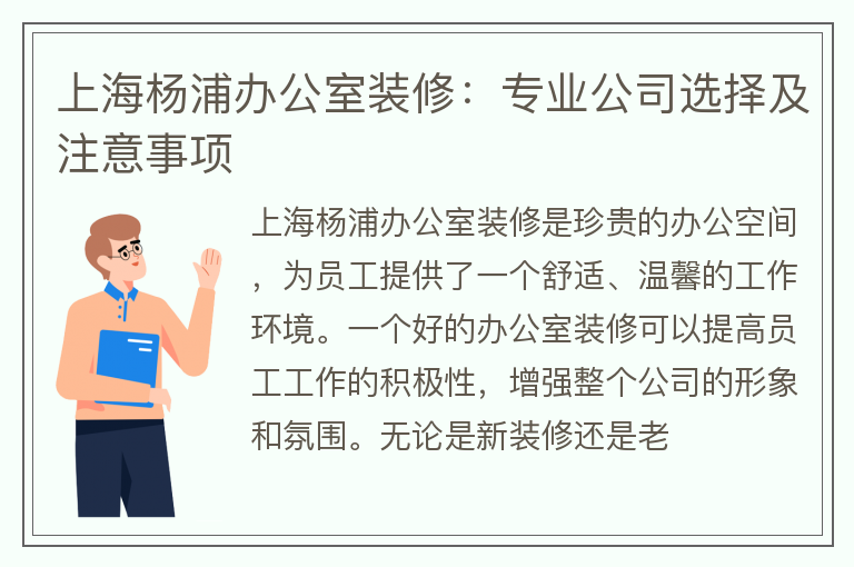 办公室是企业为客户提供服务的空间,一个具有高效率和专业形象的办公室能够提升企业形象与竞争力。而在装修办公室这个环节,选择一家适合自己的装修公司尤为重要。本篇文章将从以下五个方面介绍如何选择适合自己的上海杨浦办公室装修公司。