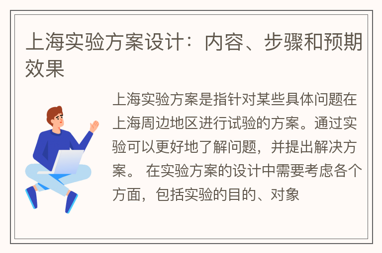 上海实验方案是指针对某些具体问题在上海周边地区进行试验的方案。通过实验可以更好地了解问题,并提出解决方案。