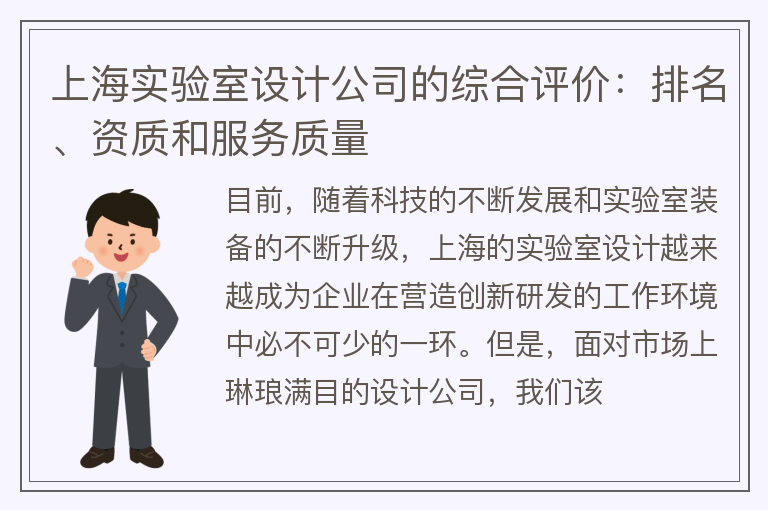 实验室设计是一门高度专业化的学科,涉及到众多领域的知识和技能。而如何选择一家具有资深实验室设计经验的公司,是许多企业和科研机构所面临的难题。本文将结合上海实验室设计行业状况,详细介绍上海实验室设计公司的资质如何。
