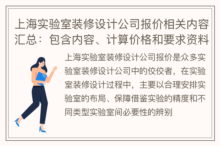 在上海实验室装修设计行业中,报价是双方合作的重要基础。如何在向上海实验室装修设计公司询价时提供准确细致的资料是一个关键因素。下面,我们将为您介绍在向上海实验室装修设计公司提供报价资料时需要注意的事项。