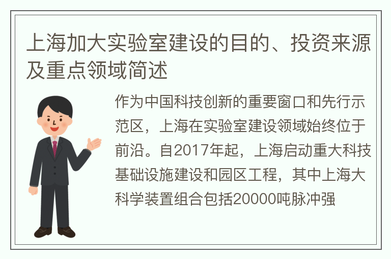 随着科技的发展,实验室已经成为了许多企业进行研发创新的重要基础设施。上海作为中国的科技中心之一,其实验室建设逐年增长,各类实验室也在成为产学研合作的重要平台。那么,上海加大实验室建设的投资来源有哪些呢?接下来我们就来探讨一下。