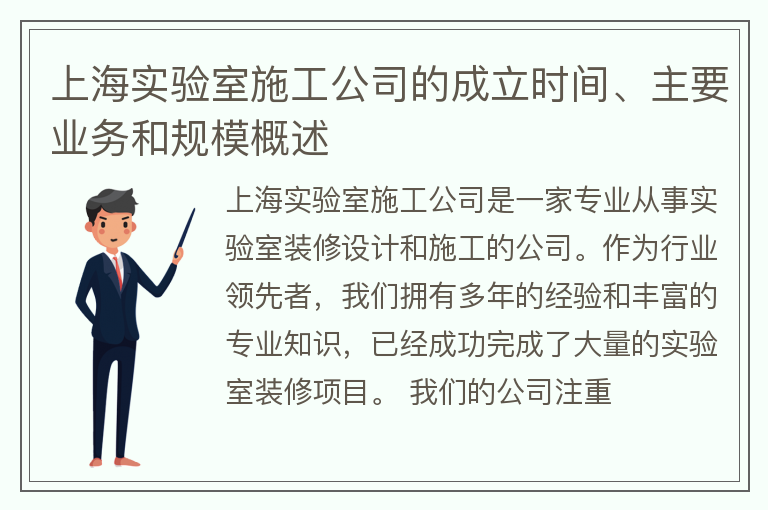 实验室施工是一项高风险、高难度的工程。选好施工资质与经验丰富的实验室施工公司,才能提高实验室建设的质量与安全性。那么,上海有哪些实验室施工公司呢?它们的成立时间与业绩表现如何?本文将为您一一道来。