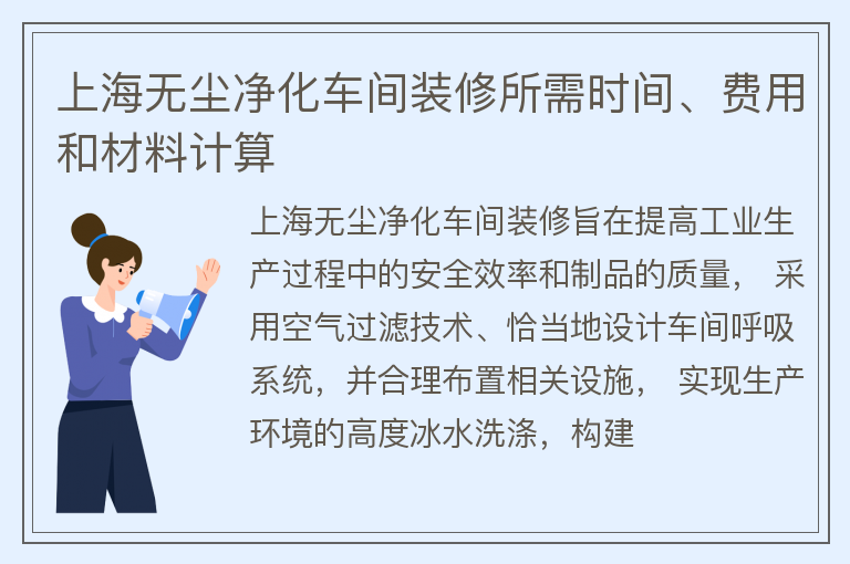 现在越来越多的企业开始使用无尘净化车间进行产品加工和生产,因为无尘净化车间能够有效保证产品质量以及工人的身体健康。但是,无尘净化车间的装修费用会比普通车间高出很多,而且装修过程中需要注意的细节也很多。那么,上海无尘净化车间装修费用如何计算呢?下面将详细阐述。