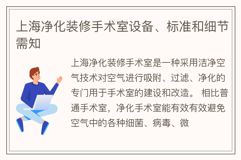 随着医学技术的不断发展和进步,净化手术室已经成为了医疗机构的重要组成部分。作为医疗机构中最需要干净、卫生、无菌环境的空间之一,净化手术室的设计和装修至关重要,也备受关注。那么,上海净化装修手术室需要符合哪些标准呢?下面将会详细阐述。