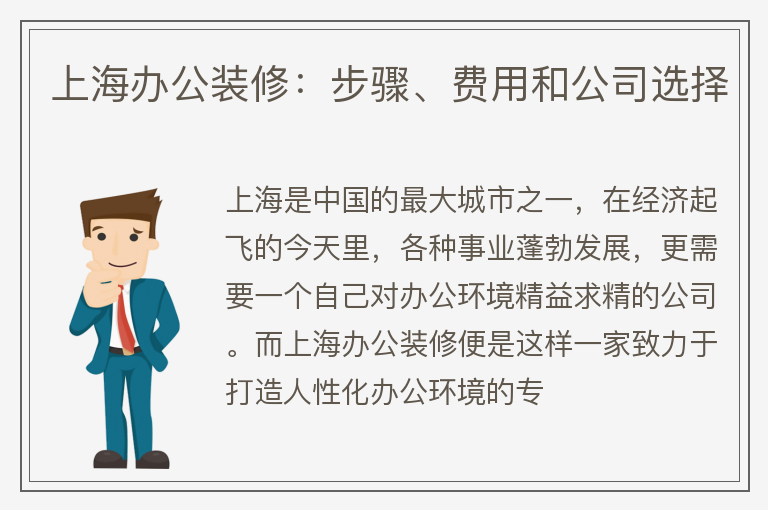 办公室是企业中重要的场所之一,办公室的装修与环境直接影响到员工的工作效率与企业形象。对于想要在上海地区装修办公室的企业而言,办公室装修事宜的处理显得尤为重要。下面介绍上海办公装修的步骤及需注意事项,希望对您有所帮助。