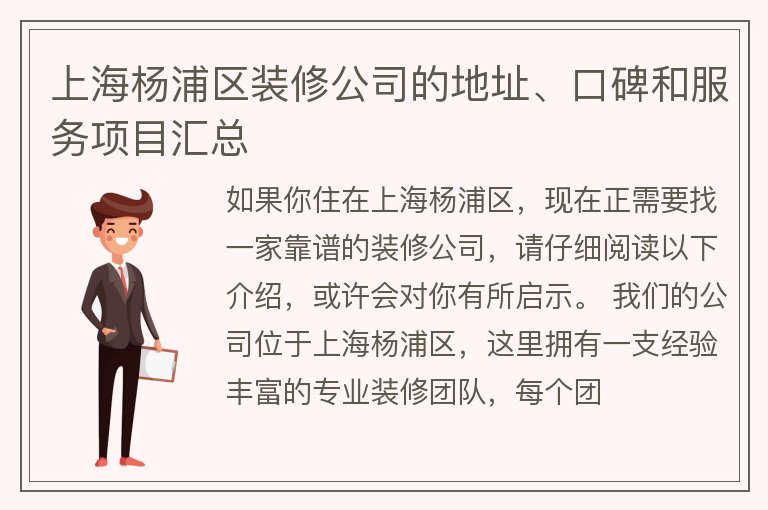 如果你住在上海杨浦区,现在正需要找一家靠谱的装修公司,请仔细阅读以下介绍,或许会对你有所启示。