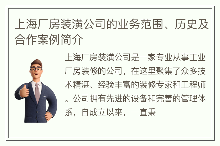 作为上海市规模较大的装修公司之一,上海厂房装潢公司已经在行业内发展了多年,并积累了不少经验和口碑。本文将从多个方面完整地介绍上海厂房装潢公司的历史、服务、案例、优势等方面,供广大客户进行参考。