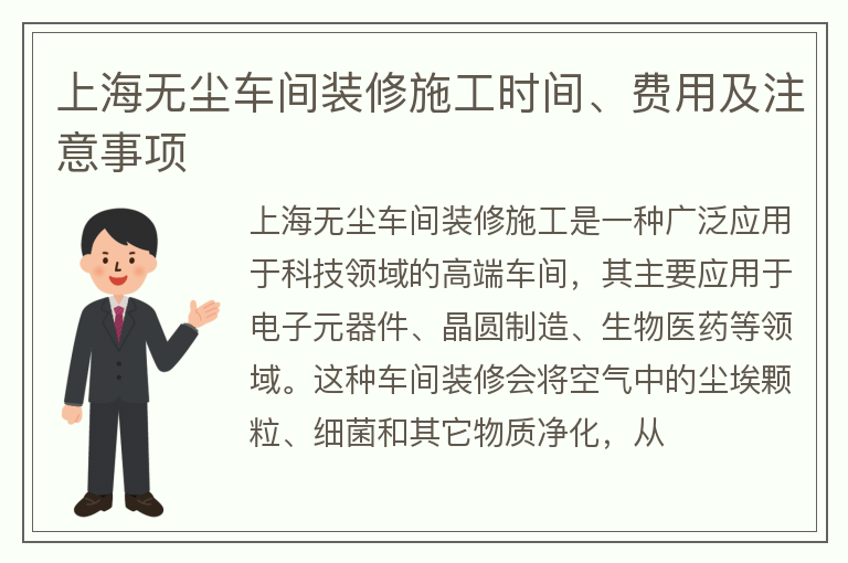 上海作为一个国际化城市,无尘车间装修施工费用相对较高。我们可以上网进行查询,针对无尘车间装修市场上有一些常见价格: