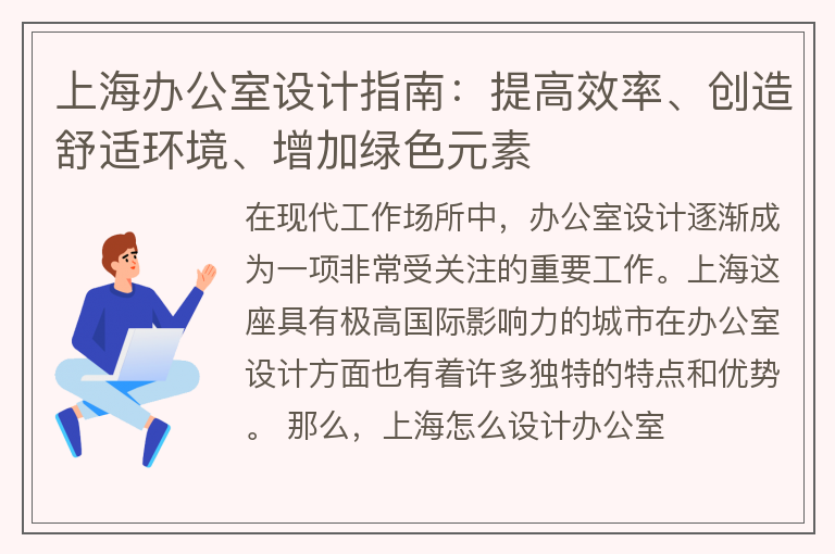 在当今这个竞争激烈的时代,公司为了吸引和留住优秀的人才,除了给出合适的薪酬和福利外,更要给员工提供一个舒适的工作环境。对于一座城市而言,办公室的舒适度与城市的发展和吸引力密不可分。在上海这个国际化大都市,如何创造一个工作舒适、生活美好的办公室环境,成了很多企业主关注及解决的重要问题。
