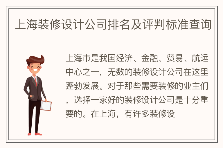 上海市是我国经济、金融、贸易、航运中心之一,无数的装修设计公司在这里蓬勃发展。对于那些需要装修的业主们,选择一家好的装修设计公司是十分重要的。在上海,有许多装修设计公司并排争鸣,而我们为您带来的是上海最权威的装修设计公司排名,希望能对您在选择装修公司时提供一些帮助。